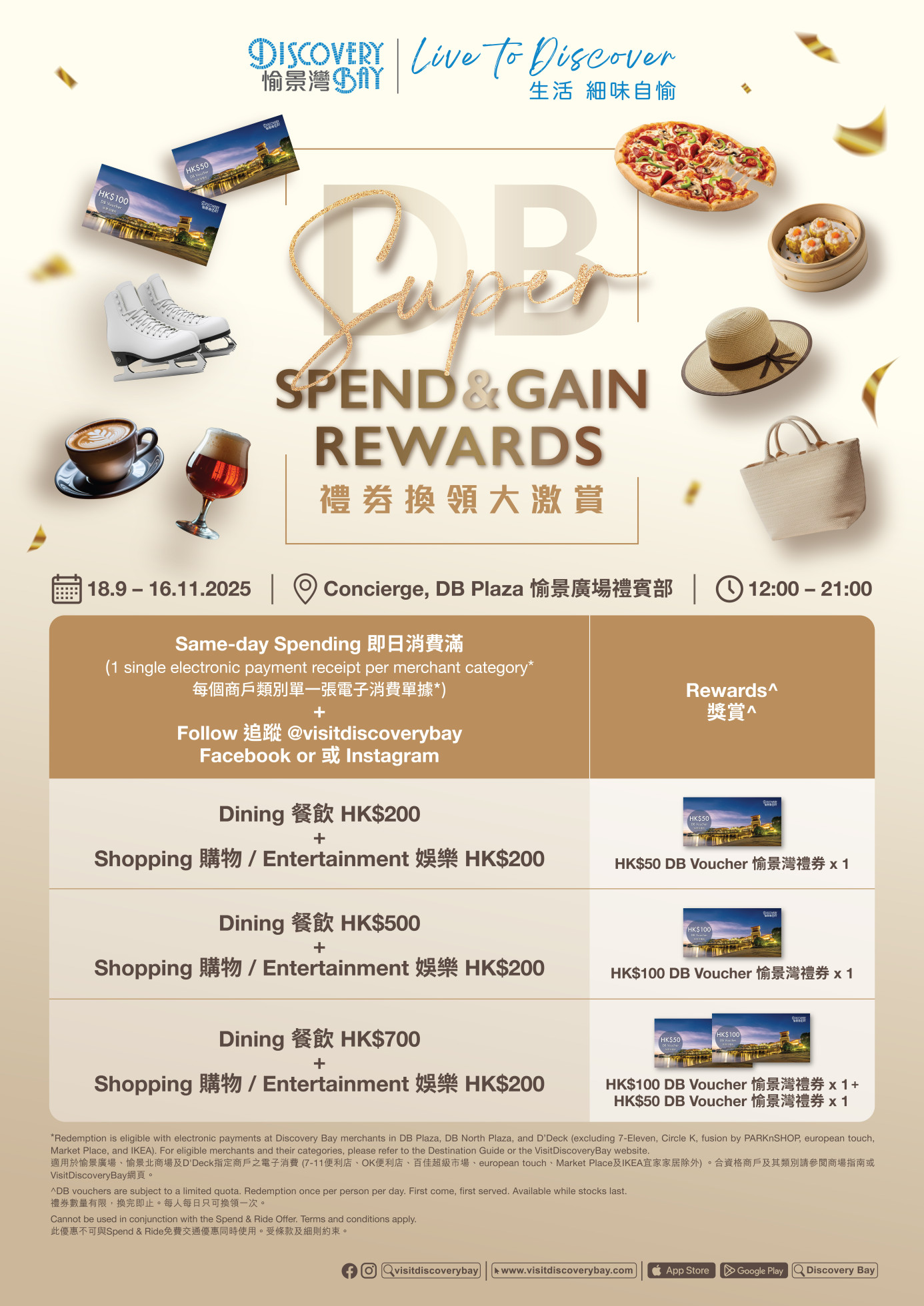 Discovery Bay has launched a limited-time “Super Spend & Gain Rewards” promotion, offering shopping rewards from its diverse leisure options. From now to 16 November, customers who spend a designated amount at participating dining, retail or entertainment merchants, and present a same day machine-printed receipt along with an electronic transaction slip at DB Plaza Concierge, can redeem cash vouchers valued at up to HK$150.