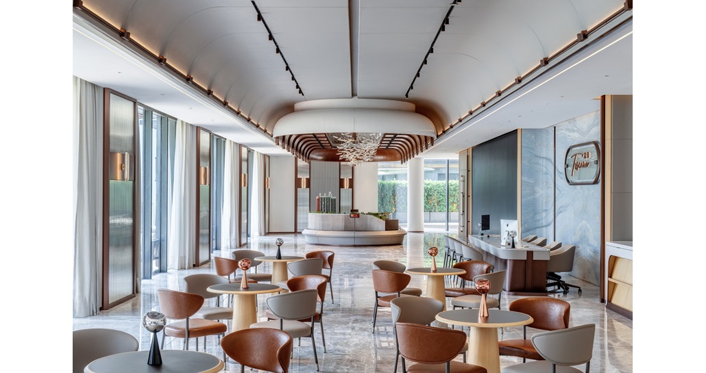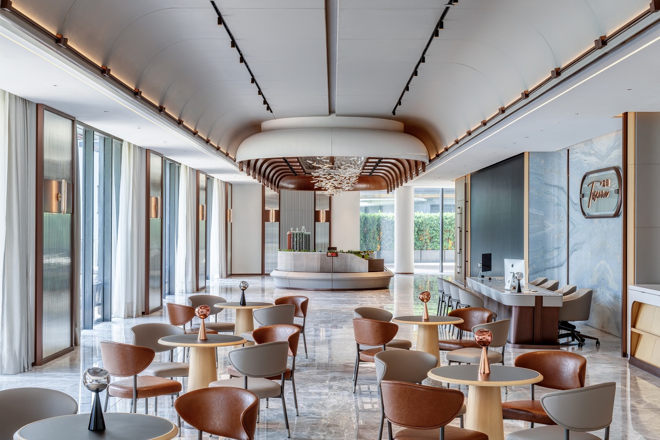为配合「Toscana 意涛」的推广销售@,香港兴业特别于「Toscana 意涛」内兴建一幢独立建筑物作为展销厅,此为全港罕见,可见香港兴业对「Toscana 意涛」的重视和远见。「Toscana 意涛」展销厅以意式经典美学作主题,楼面面积广约 17,480 平方呎,并设逾 14,300 平方呎意式花园和逾 9,900 平方呎天台,客人可在此欣赏愉景湾的山海景致*,以及近距离观赏「Toscana 意涛」项目的大厦外型。展销厅由知名设计团队 ARTTA Concept Studio精心设计,灵感源自意大利的托斯卡纳 (Toscana),巧妙融入「意大利现代豪华宅邸」和「愉景湾度假式生活」设计理念,采用意式高楼底拱型天花造型,特设意式咖啡吧台,高级用料精选大地色系和自然色调的石灰石、大理石、高质木材、皮革及青铜等,展现意式精湛工艺,同时彰显了 「Toscana 意涛」项目的实用性与意式建筑美学,为客人提供沉浸式的尊尚参观体验,更能感受到「Toscana 意涛」的意式精致而贴近自然的优裕生活方式。