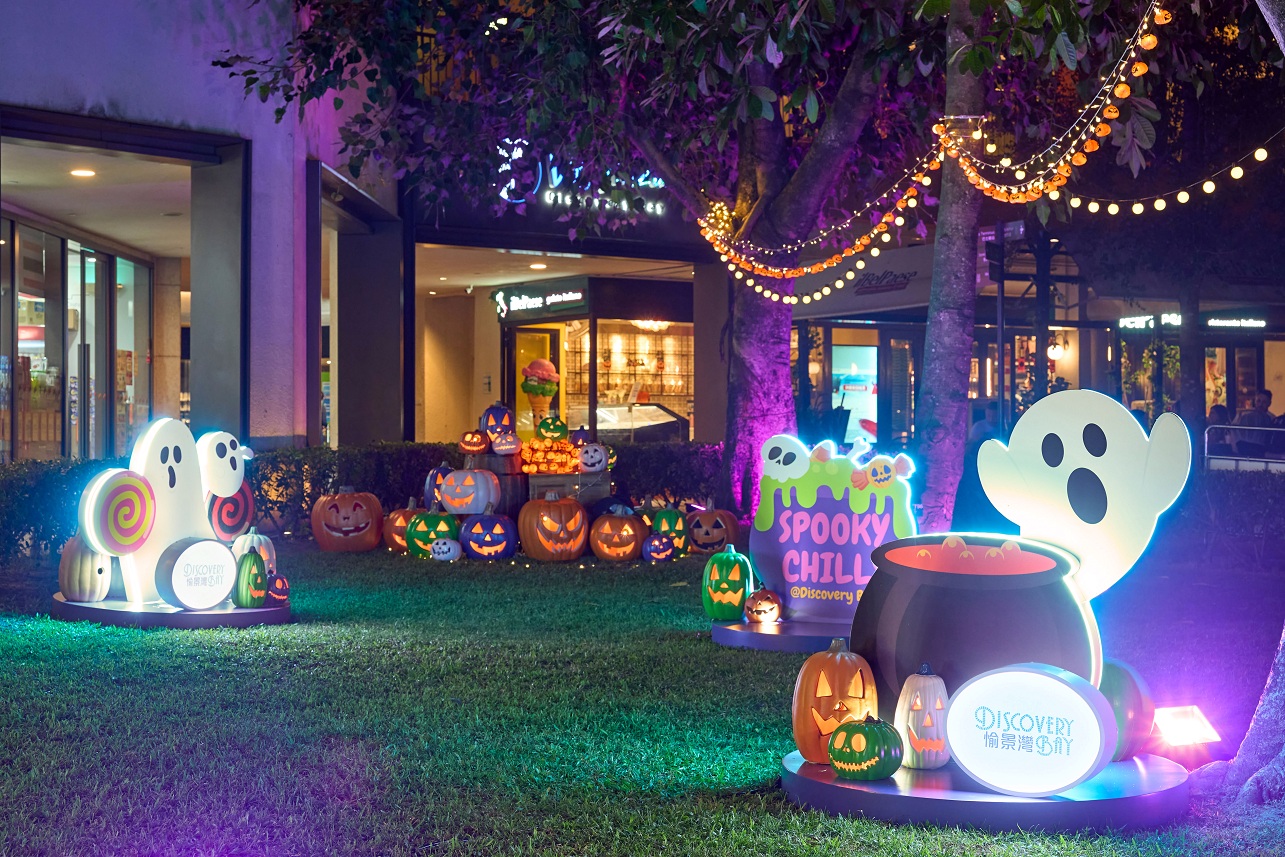 愉景灣將化身為「鬼魅莊園」,讓一家大細齊感受驚喜連連的節日魅力!穿過閃爍的發光拱門,踏進神秘草地尋找「掏蛋鬼」的蹤影,燈光裝置營造出奇幻詭異的神秘氛圍。愉景廣場及愉景北商場的噴泉亦換上萬聖節裝飾布置,鬼怪南瓜和嘩鬼精靈等齊齊登場!此外,愉景北鐘樓更見驚喜,特設八米高巨型蜘蛛網打卡位,加上七隻發光蜘蛛營造出震撼視覺效果。